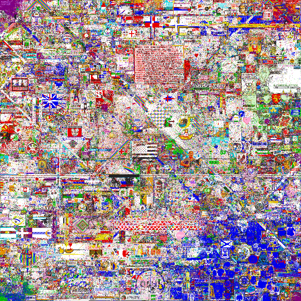 A composition of the each pixel's average color over the course of the event (also visible in the zoomable map above). "Average" is the mean of pixel colors in CIE L*a*b* space, weighted by the amount of time the pixel spent at each color. I really like this view; you can see the palimpsest nature of the canvas.